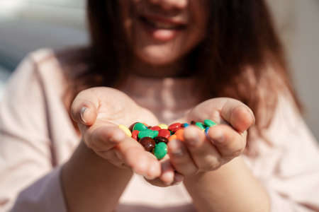 Cropped image of lots of chocolate candies in fat woman's hands while she give it to the camera.