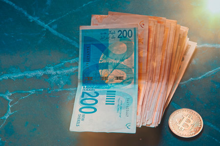 Roll Israeli Shekel ILS banknotes near cryptocurrency tokens Bitcoins bit coins, saw from above, on old marble board. Selective focus. with space for text placement.