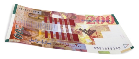 A 200 Israeli Shekels (NIS) bank note isolated on white background.
