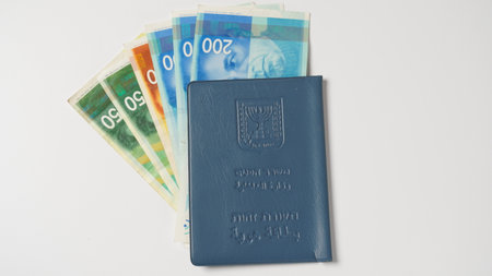 Israeli identity card(Teudat Zehut)with colorful Shekel banknotes inside on white background