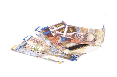 background of a stack of Israeli money bills banknotes of 100 and 200 shekel isolated on white. New Israeli Shekel series C. Selective focus
