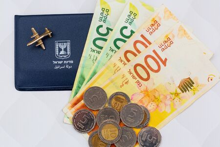 ID and shekels, coins. politics money and financial crisis of rich Israel background. saving cash. business in Israel.