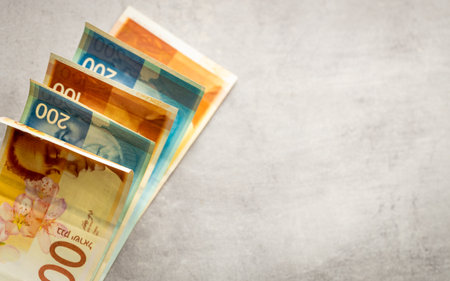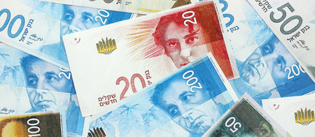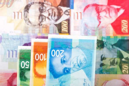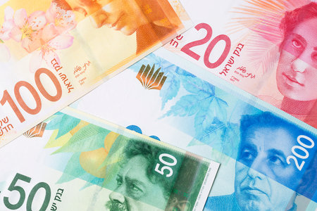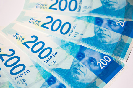 New Israeli Shekels banknotes with the new 200, 100, 20, 50 sheqel. Wallpaper of shekels bills Top View. Politics and money of Israel background.