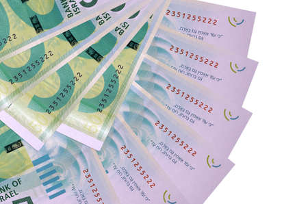 50 Israeli new shekels bills lies isolated on white background with copy space stacked in fan shape close up. Financial transactions concept