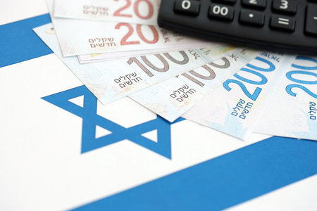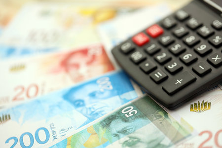 Israel New Shekels banknotes and calculator. The current Israel money bills and calc lies on table in big amount. The concept of taxation and money count in Israel