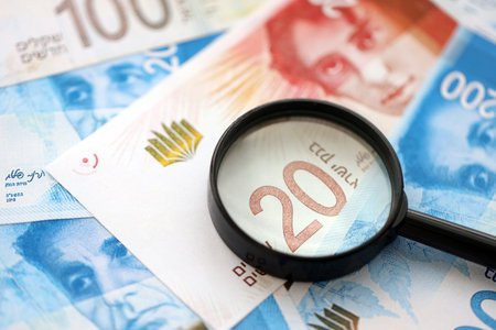 Israel New Shekels banknotes and magnifying glass. The current Israel money bills with loupe lies on table in big amount. The concept of financial monitoring and taxation in Israel