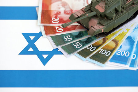 Israel New Shekels banknotes and toy tank on flag. The current Israel money bills and tank lies on flag in big amount. The concept of army funds and weapons sales in Israel