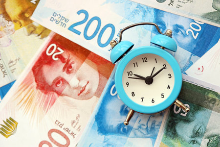 Israel New Shekels banknotes and alarm clock. The current Israel money bills and clock lies on table in big amount. The concept of time management and income in Israel