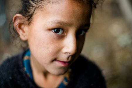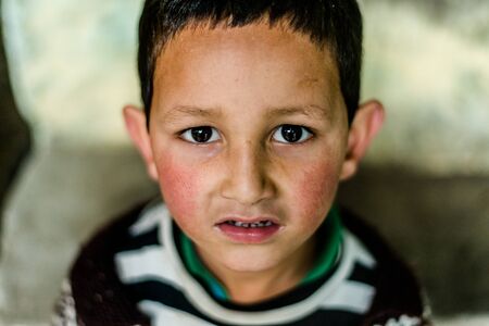 Kullu, Himachal Pradesh, India - Feburuary 07, 2019 : Portrait of himalayan kid in mountain, sainj valley