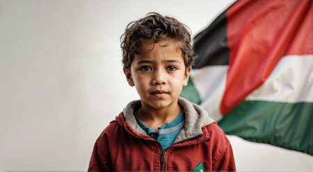 Portrait of a Child Looking in Distance With a Palestinian Flag Background