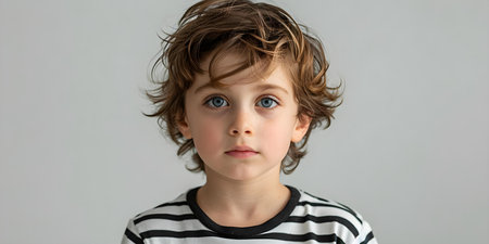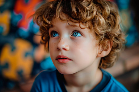 A portrait of surprised kid boy with curly hair. Children and emotions concept