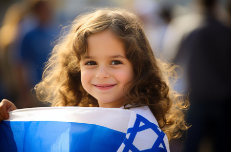 A cheerful boy around six years old beams with joy in a lively street in Israel. He wears a blue striped shirt and displays a sense of innocence and curiosity typical of young children.