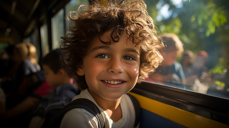 Smiling schoolboy getting on the school bus, happy to return to school after summer break