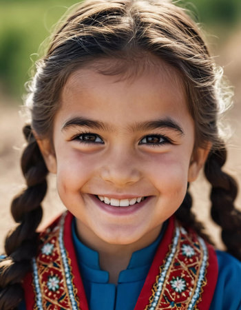 In a tranquil outdoor setting, a young Armenian girl with braided hair gazes confidently at the viewer, embodying her rich cultural heritage.