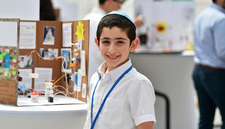 Young boy proudly presents his science project at a fair, wearing a blue kippah and white shirt, surrounded by colorful display boards and engaged audience, AI generated