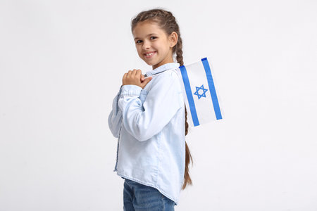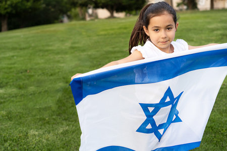 Happy child holding Israel flag and running. Young girl with Israeli flag in beautiful rural landscape.