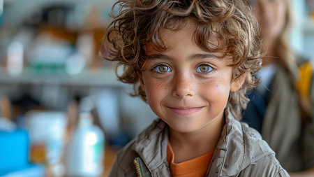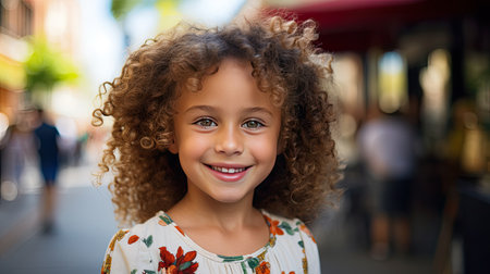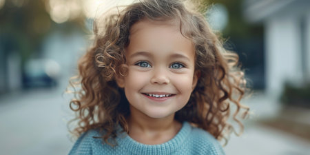 A young girl with curly brown hair smiles brightly, her blue eyes sparkling with happiness.