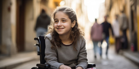 Cheerful girl in a wheelchair enjoying a vibrant city atmosphere, radiating positivity.