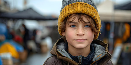 Life Amidst Conflict: A Portrait of a Young Refugee Boy in a City Street surrounded by Homeless People. Concept Portrait Photography, Refugee Crisis, Homelessness, City Life, Humanitarian Stories