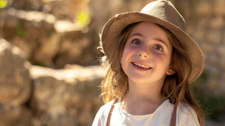 A little girl in a straw sun hat is happily smiling for the camera, adding a cute fashion accessory to the beautiful landscape. She seems to be having fun and enjoying her travel adventure AIG50