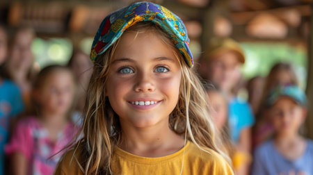 A young girl with blonde hair, wearing a colorful patterned cap and a yellow shirt, smiles brightly at the camera. She is surrounded by other children, likely at a summer camp or outdoor program. The girls expression is cheerful and innocent, capturing the joy of childhood and the carefree atmosphere of summer.