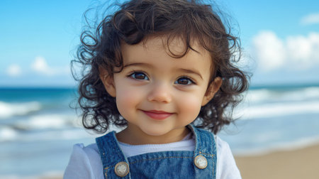 A joyful toddler with curly black hair stands on the sandy beach, wearing overalls and flashing a mischievous grin. Waves crash gently in the background under a clear blue sky.