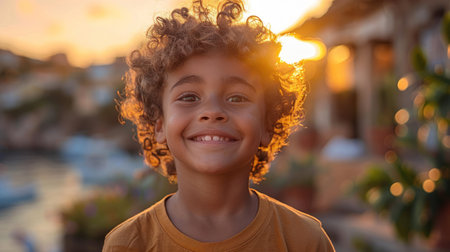 A smiling Tajik boy 5 years old beams with happiness, enjoying the beauty of a sunny day outdoors. His cheerful expression reflects moment of pure joy and innocence. Happy smiling child. AI generated.