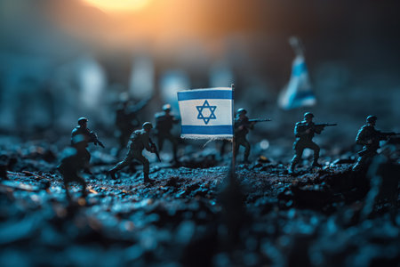 Israel on dark background. Conceptual image of war between Israel using toy soldiers. Selective focus. Generative AI
