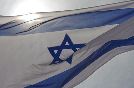 Israeli flag weaving in the wind against bright skies