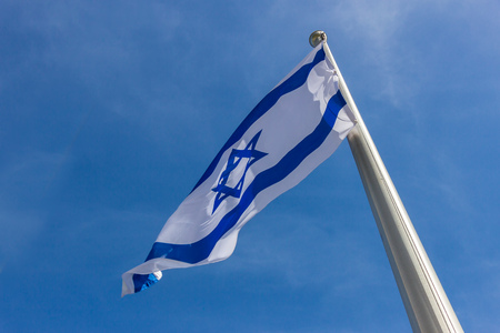 White and blue flag with Star of David fluttering in the wind in a close-up front view.