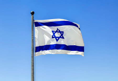 The Israeli flag waves in the bright sunlight, its blue Star of David prominent against the white background