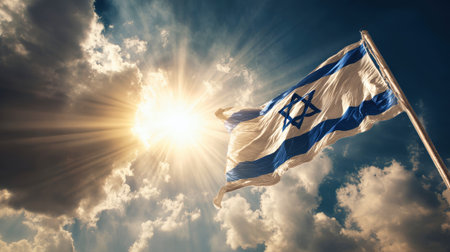 An Israeli flag flutters proudly in the wind, illuminated by warm sunlight streaming through dynamic clouds in the sky, symbolizing hope and pride.