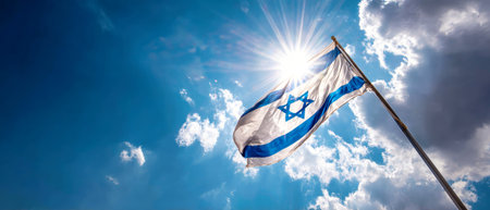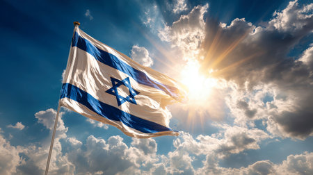 In a stunning display, the flag of Israel waves proudly against a bright blue sky filled with white clouds and sunlight illuminating the scene.