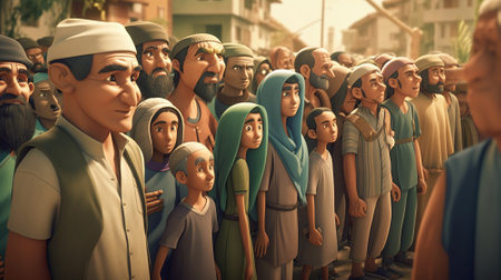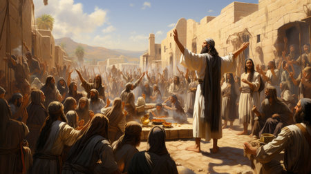 Jesus teaching and leading his apostles in a city Generative AI Illustration.