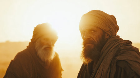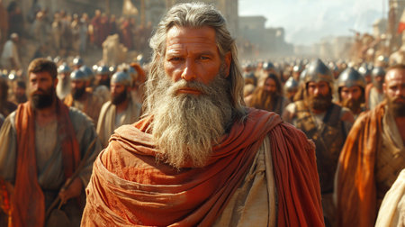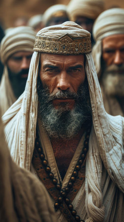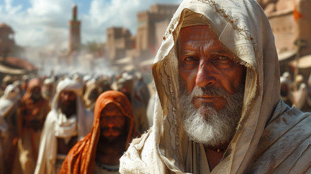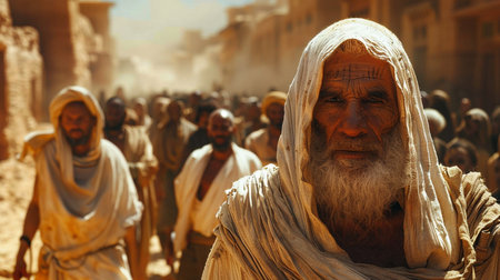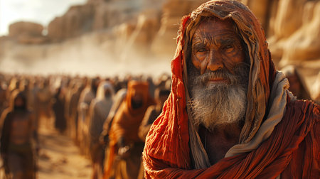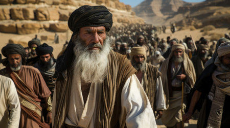 close-up shot of Prophet Moses, with a long white beard and a dark turban, leading his followers through the desert.