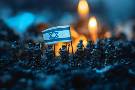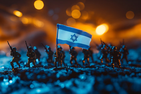 Israel on dark background. Conceptual image of war between Israel using toy soldiers. Selective focus. Generative AI