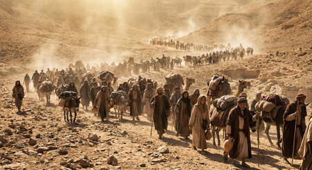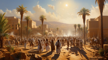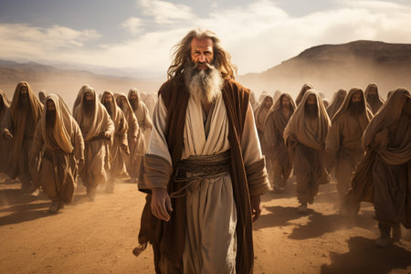 Illustration of Moses leading the people of Israel in the desert on the way to Canaan Generative AI.