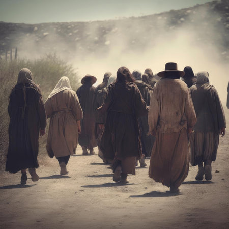 group of people, including Prophet Moses, walk in a line through a barren desert landscape. They carry belongings and wear simple clothing.