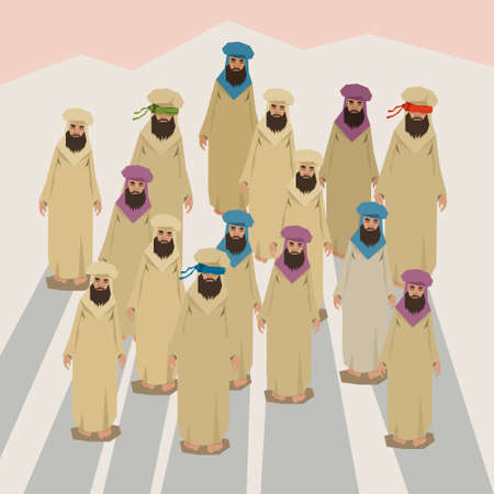 Arab People Group Traditional Clothes Desert Crowd Full Length Flat Vector Illustration
