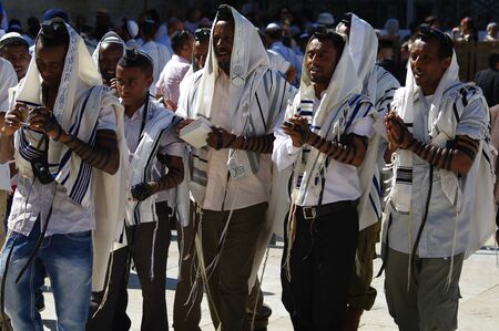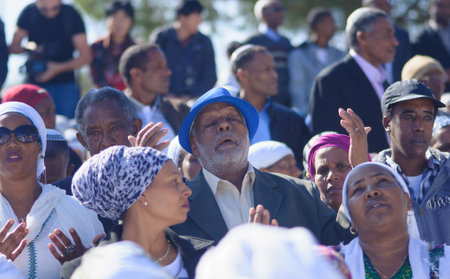 JERUSALEM - NOV 20, 2014: Ethiopian Jewish men and women pray at the Sigd, in Jerusalem, Israel. The Sigd is an annual holiday of the Ethiopian Jews