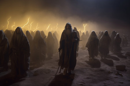 Led by faith and divine calling, Moses guides Israelite Jews through impenetrable wilderness, lighting way for them reach promised land and providing them with divine protection. desert