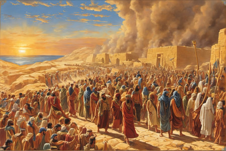 A diverse group of ancient people expresses fear and surprise while witnessing an event from a biblical narrative with vibrant colors
