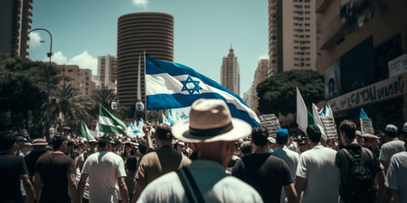 Crowd protest in Israel against the current government with the flags of the country of Israel, the conflict with Palestine, a peaceful march of citizens for freedom democracy, elections.Generative AI