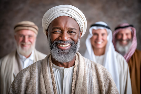 Group of religious leaders joyfully sharing a light moment together while wearing traditional attire. Neutral background enhances their expressions and fosters a respectful atmosphere.