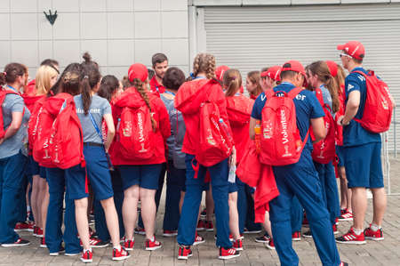 KAZAN, RUSSIA - 18 June, 2017: group of young volunteers wearing uniform having meeting with supervisor in front of Kazan Arena stadium before match during FIFA Confederations Cup