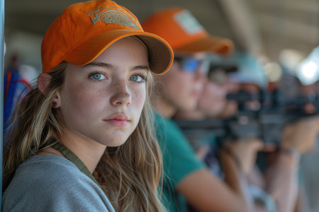 A girl wearing an orange hat firmly holds a gun, demonstrating her connection to the USA Rifle Association and their raw