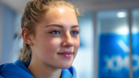 A young woman with blonde hair pulled back and blue eyes smiles slightly as she looks off to the side. She is wearing a blue hooded sweatshirt and has small stud earrings in her left ear.