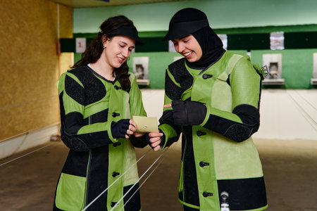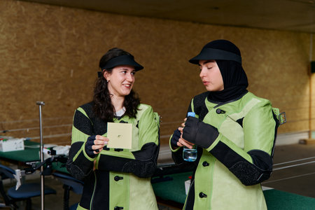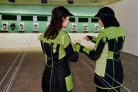Two female athletes in shooting gear analyzing target, one wearing hijab, at indoor shooting range, sports competition, teamwork, focus and precision in competitive shooting sport.