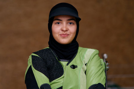 Portrait of a young Muslim woman wearing a hijab and shooting gear, looking at camera, indoor studio shot, confident athlete, determination, sportsmanship, and cultural representation.