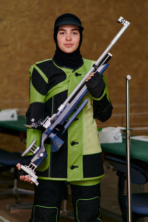 Female athlete wearing professional shooting uniform and hijab carefully aiming with an air rifle at an indoor range.